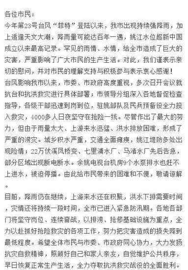 告全体市民书各位市民:今年第23号台风“菲特”登陆以来,我市出现持续强降雨,加上适逢天文大潮,降雨量可能达百年一遇,姚江水位超新中国成立以来最高记录。